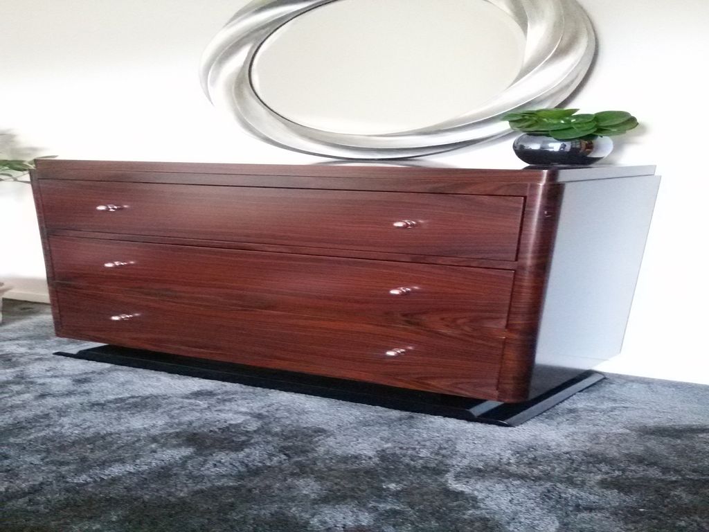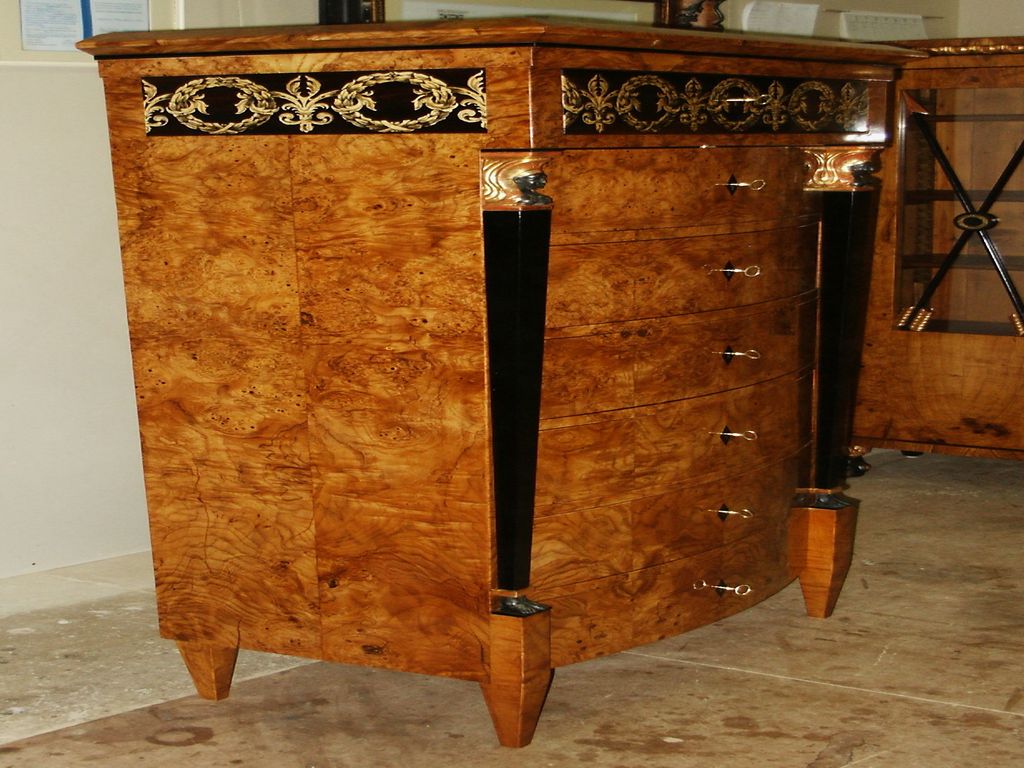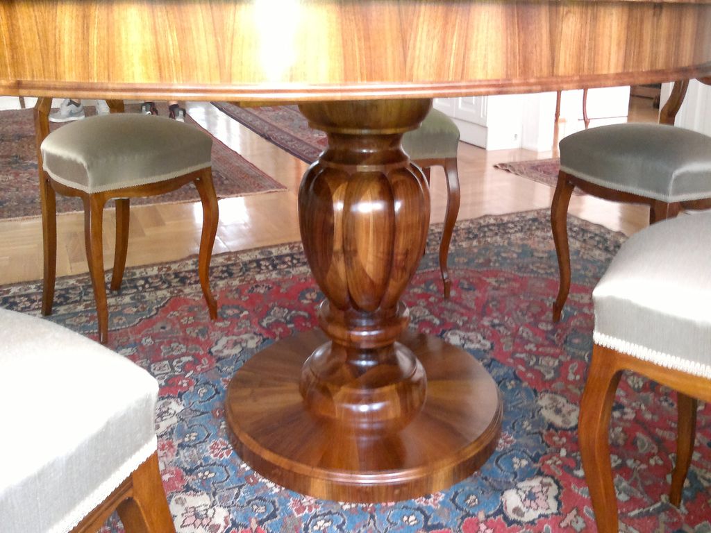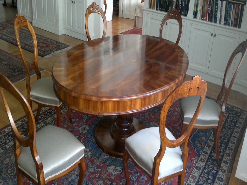 Beidermeier cseresznyefa szék Cseresznyefa karzat és svájci körte beépített szekrény Diófa borítású könyvespolc Egyedi étkezőasztal kárpitozott székekkel Egyedi falburkolat Egyedi komódok Paliszander borítású multimédiás TV állvány Paliszander furnérozású Art-Deco komód